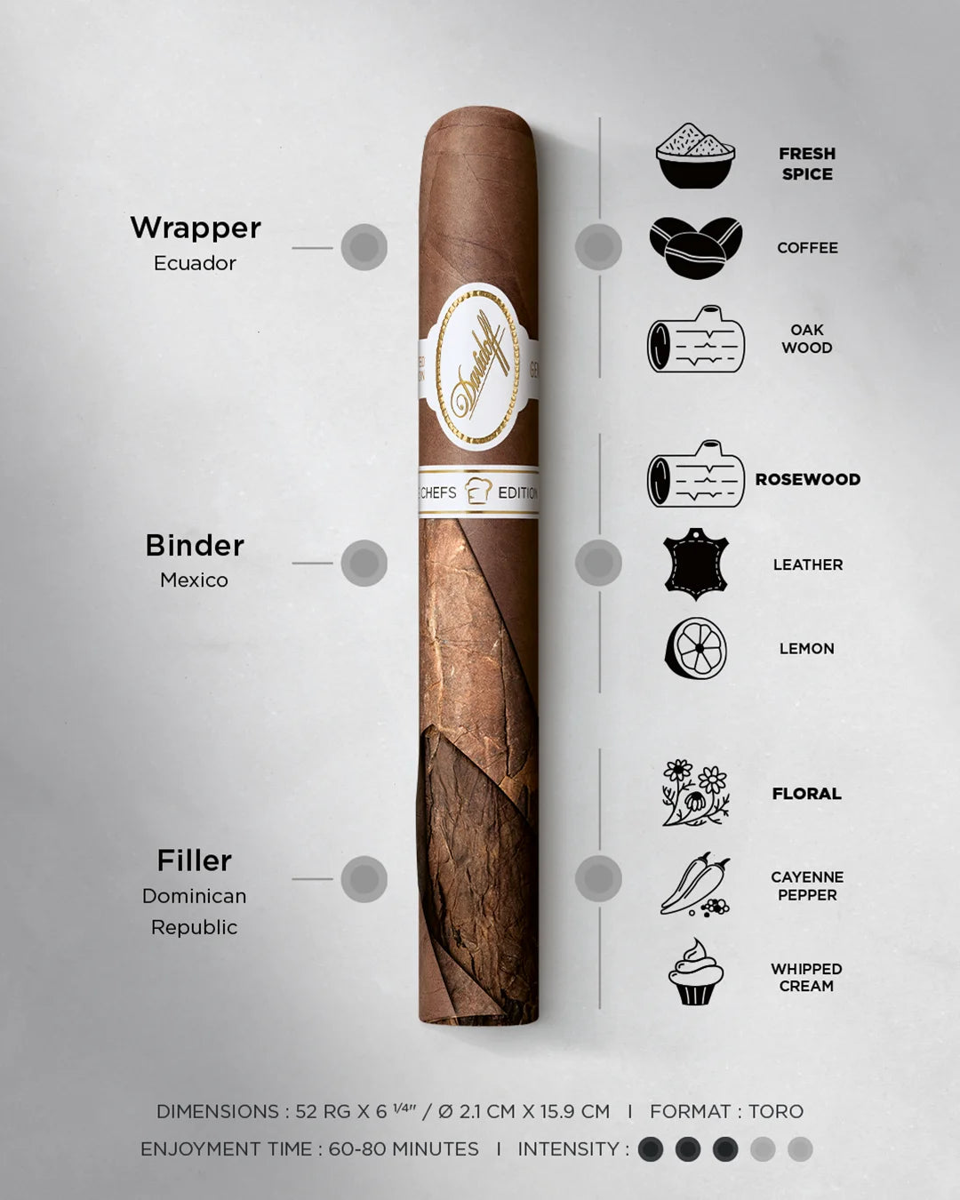 「シェフズエディション2025 トロ」は、ダビドフを象徴するホワイトバンドコレクションから厳選された葉を取り入れ、その味わいにおいて、シェフたちが持つ軽やかさと繊細さを映し出しています。
